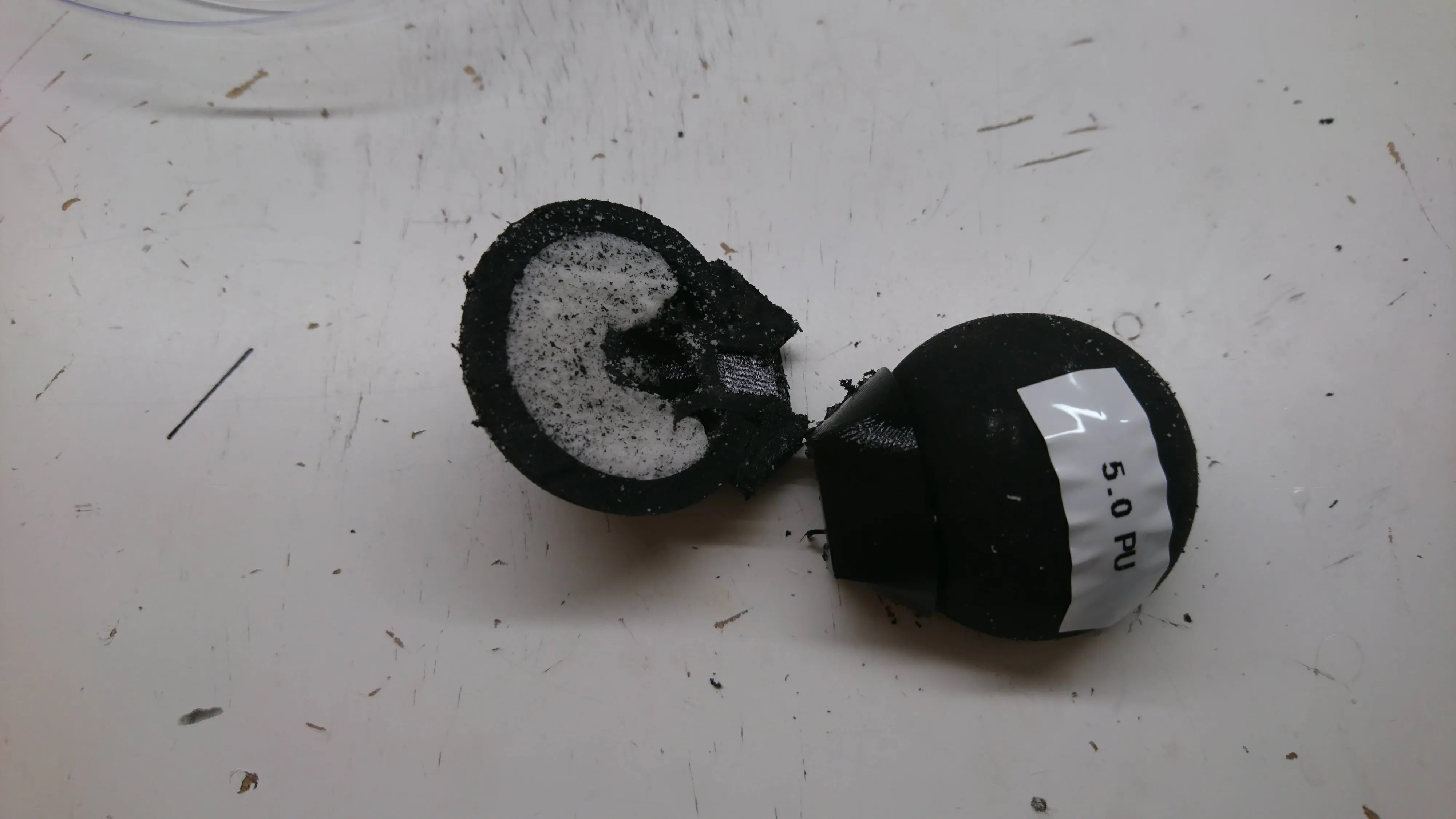 To start with, I used a random single yellow dot squash ball with a hole cut in one side using a pair of side cutters. For the casting foam, I just used Smooth-On Flex Foam-IT 17, which is what Ben Katz originally used at least. Initially I just mixed up a batch, poured it in to a random level, stuck my bracket in and hoped for the best.