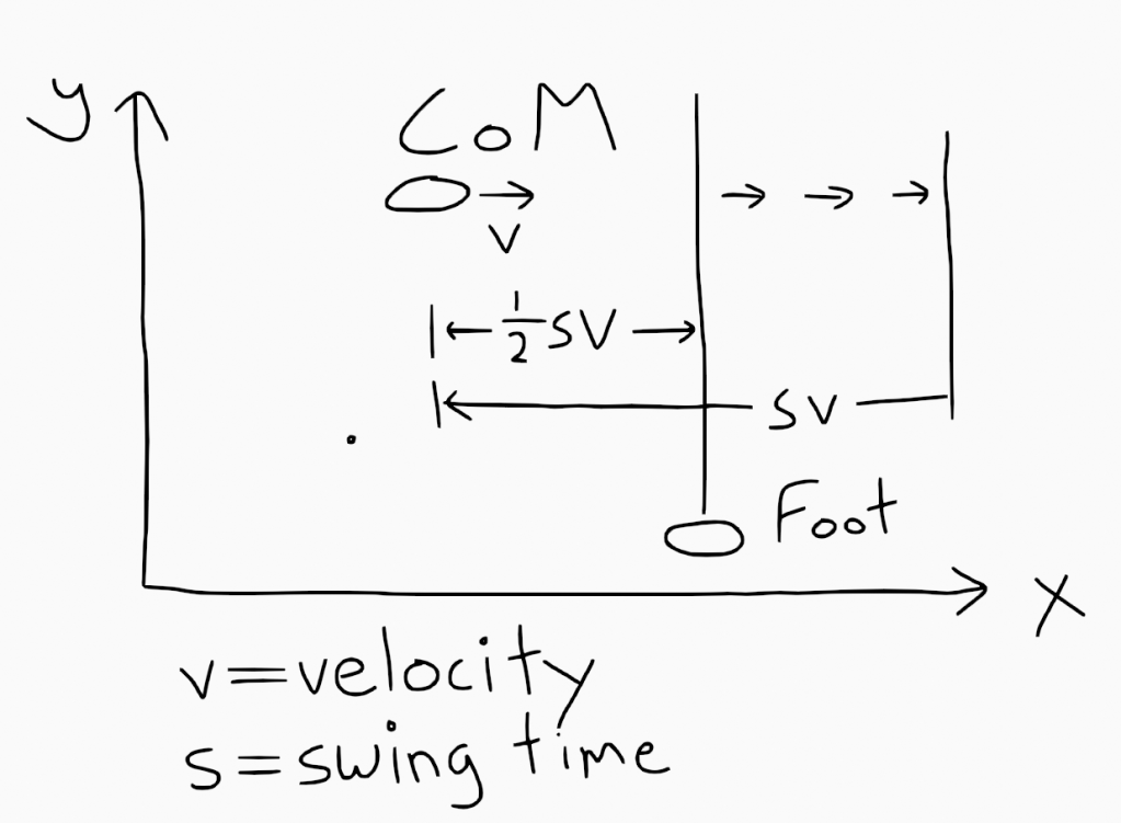 In fact, this also holds for a more general case, as long as we don’t attempt to accelerate during the swing phase itself. All that is necessary is to start the swing when the center of mass is half a swing times away from the support point at the current velocity and not accelerate until the foot is down again.