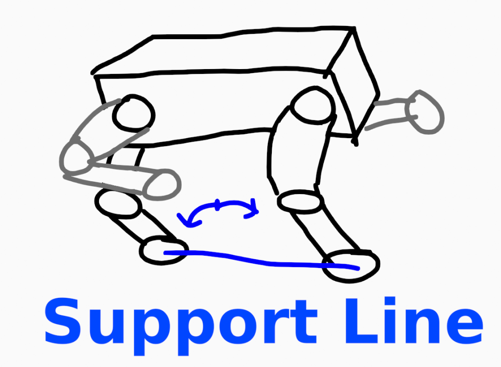 First, the obvious: When the robot has legs on the ground, they support it. If all four legs are on the ground, they form a support polygon. If the center of mass of the robot is within this polygon when projected onto the ground, the robot will happily sit there forever without tipping over.