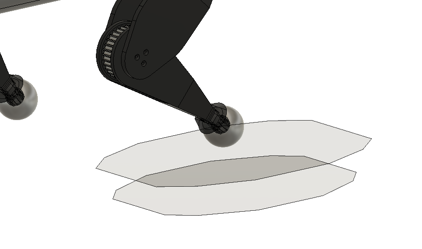 The first part of that is determining when a leg position will become infeasible. I chose to make several approximations. When starting up, for each leg, a sampling approach is used to mark out the feasible region in the joint reference frame for the standard height, and for the leg-lifted height. This results in two 2D polygons: