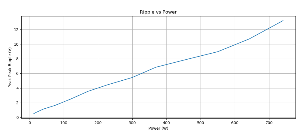 In another discord moment, someone was asking about the difference between electrolytic capacitors and multi-layer ceramic capacitors. That, plus some desire to re-rate the moteus, inspired me to do another sweep and measure the DC bus voltage ripple for various power levels. I captured this plot with a 24V power supply, with a 5008 motor with 0.061 ohm of winding resistance or so, and each current being applied for 300ms. The voltage ripple is peak to peak measured at the power connector.