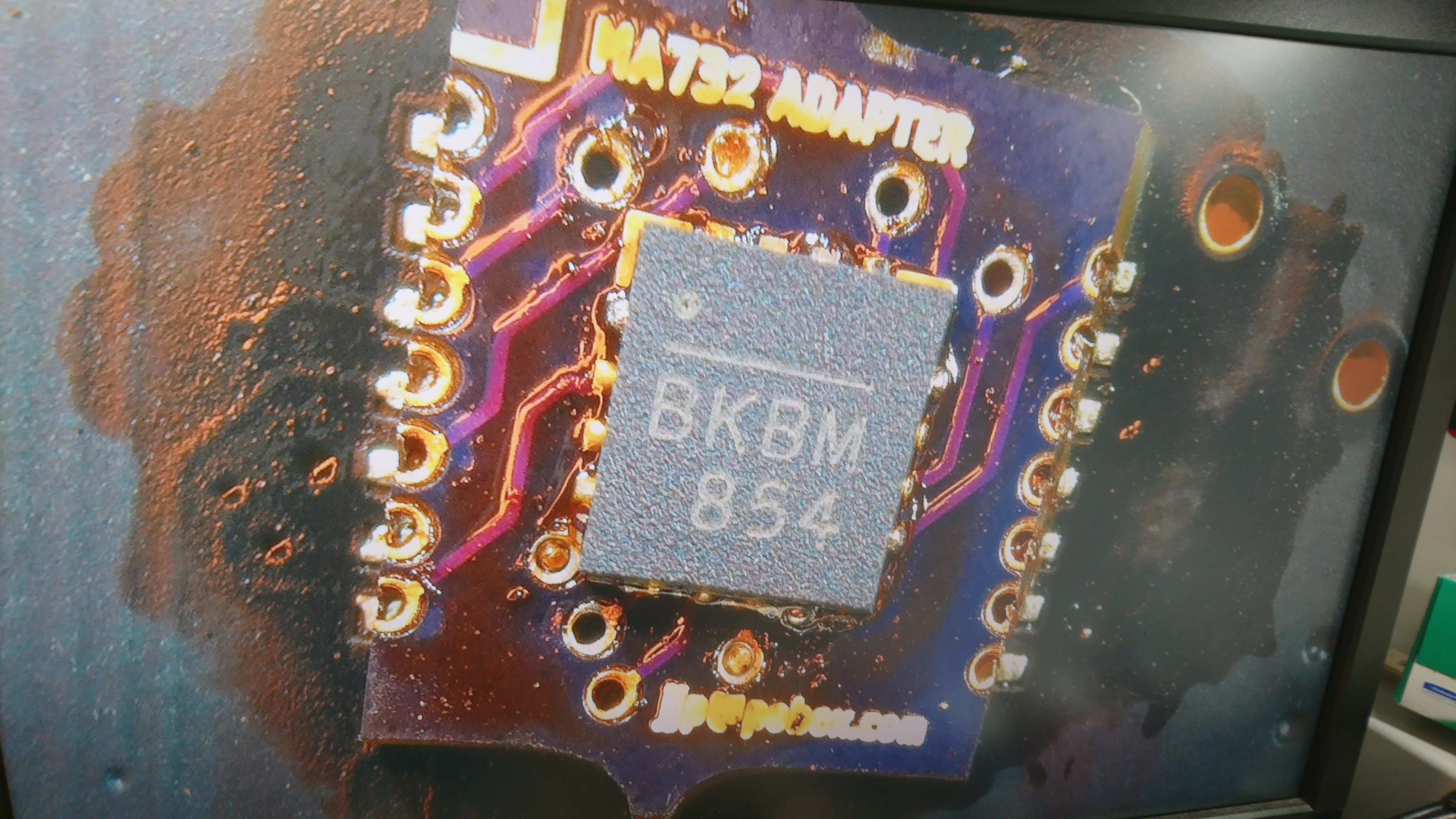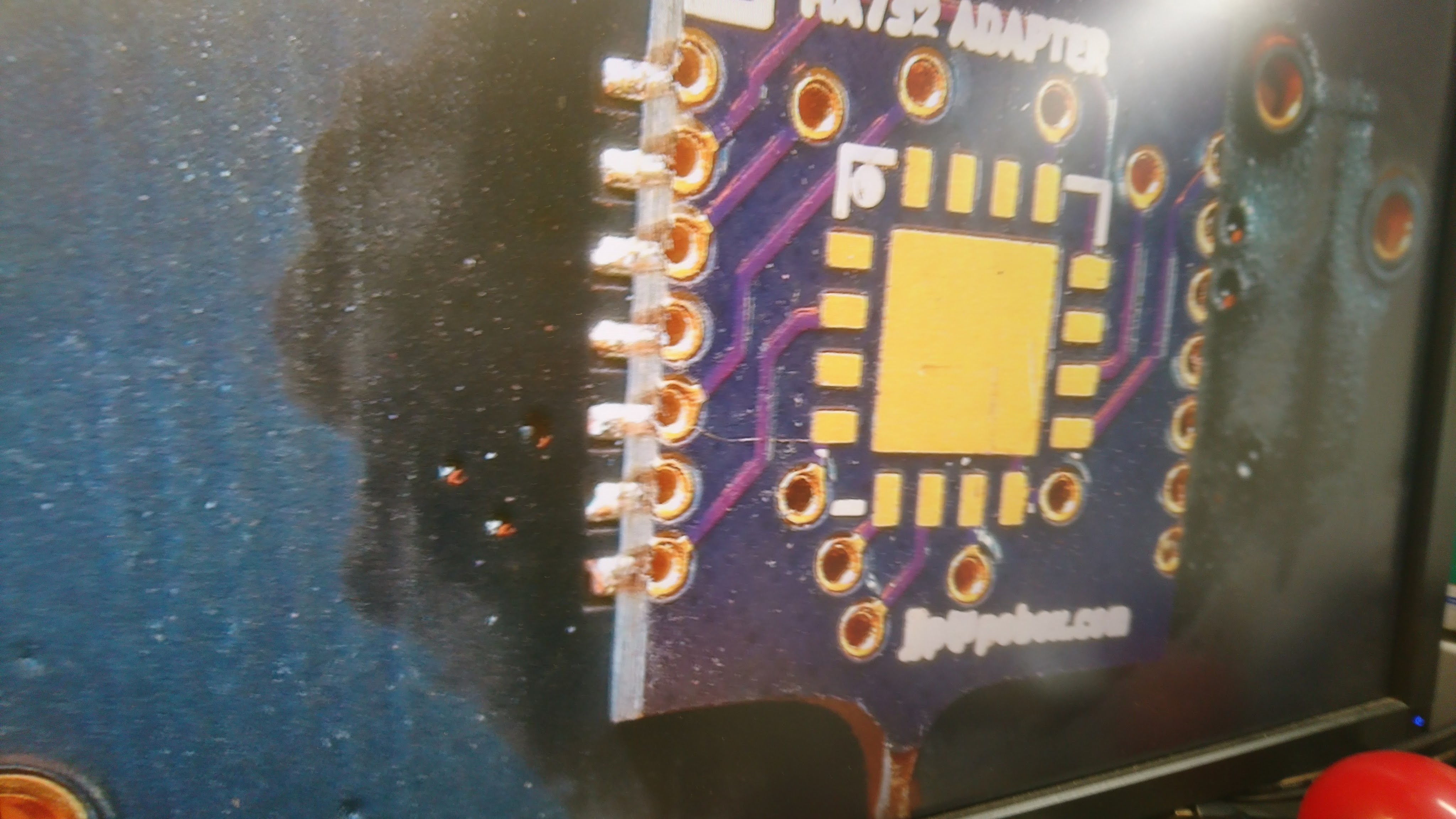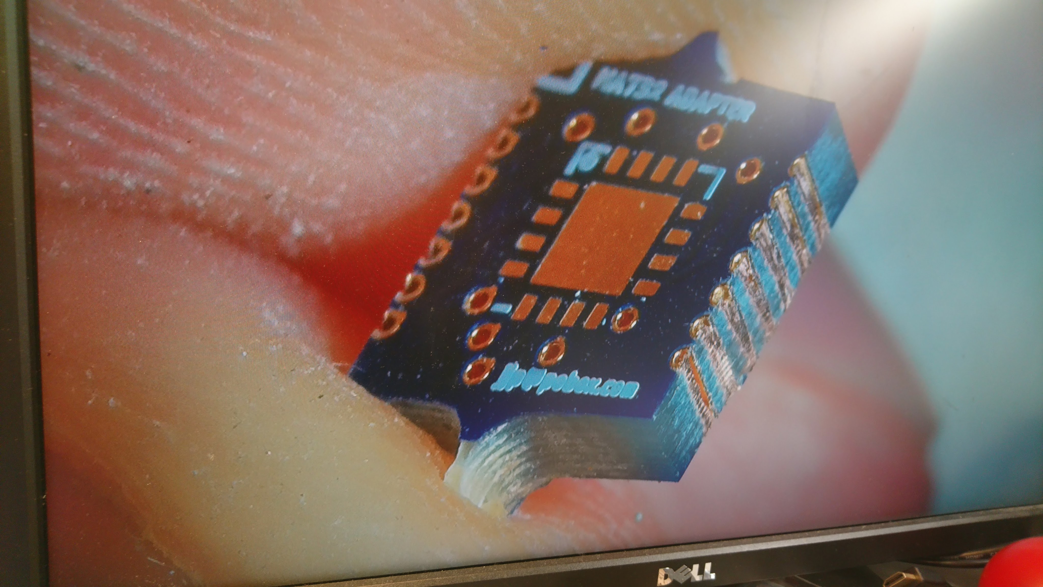 It is from oshpark – I had to hand dremel the edges to get all the vias exposed. Since it was a one-off, I didn’t worry too much about getting perfect alignment when soldering it up. Here’s a microscope image of the side with the best alignment.