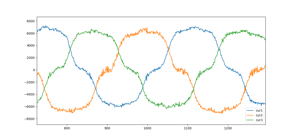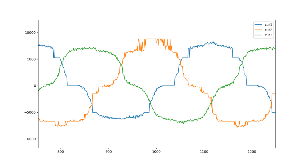 Here’s a plot showing the 3 current values as the voltage phase was advanced through a few cycles: