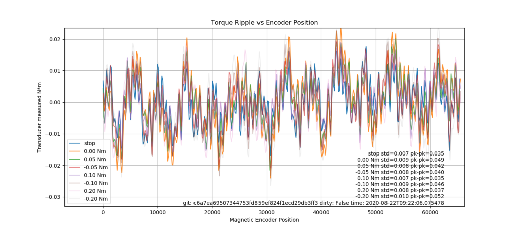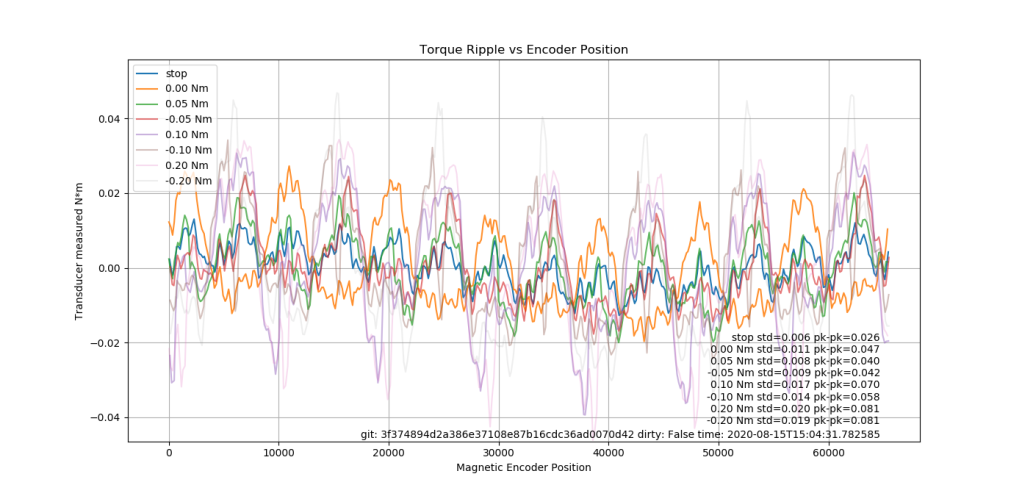Post fixes, the torque ripple at all the tested torque levels is nearly indistinguishable from the torque of the completely unpowered motor, which is what we want to see!