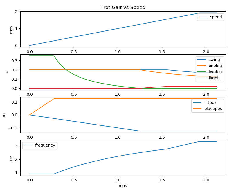For a given maximum distance the legs can move through, that results in key gait parameters changing with speed as in the plot below: