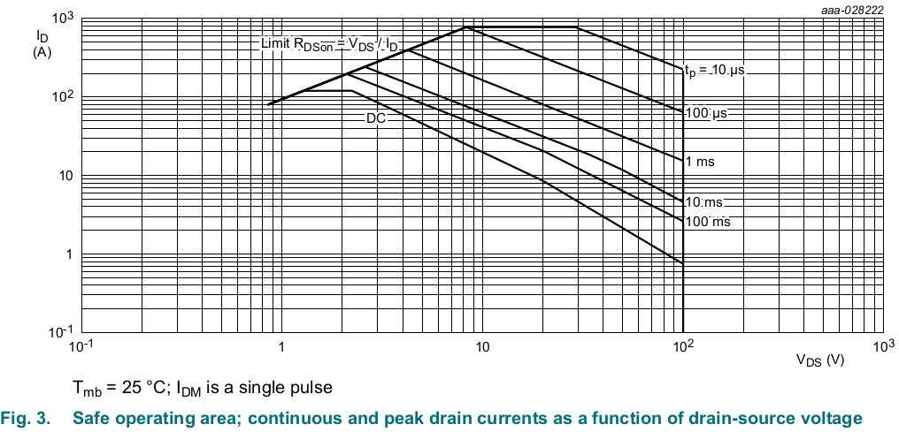 For a given FET, it will have a “safe operating area” plot like the below (this from the PSMN3R7-100BSE used in the soon-to-be-released power_dist r4):