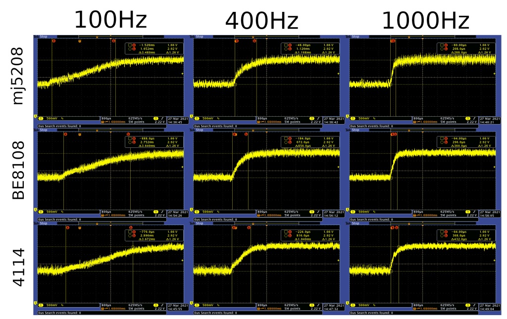 To make sure these make sense, I used this process for a few different bandwidths on a few different motors. For each, I used an oscilloscope to measure the rise time of the current waveform in response to a step input of a relatively small 4A command. The shape of that curve lets us be pretty confident that the damping ratio is correct, and the total rise time of the curve gives a good measure of the overall bandwidth that was achieved.