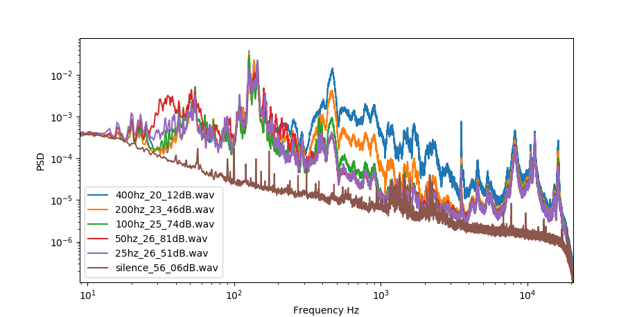 This shows that there are peaks in the noise at around 700Hz and 2kHz and after that the noise drops off rather rapidly. Then if we enable filtering at a few different bandwidths, you can see how the plot changes: