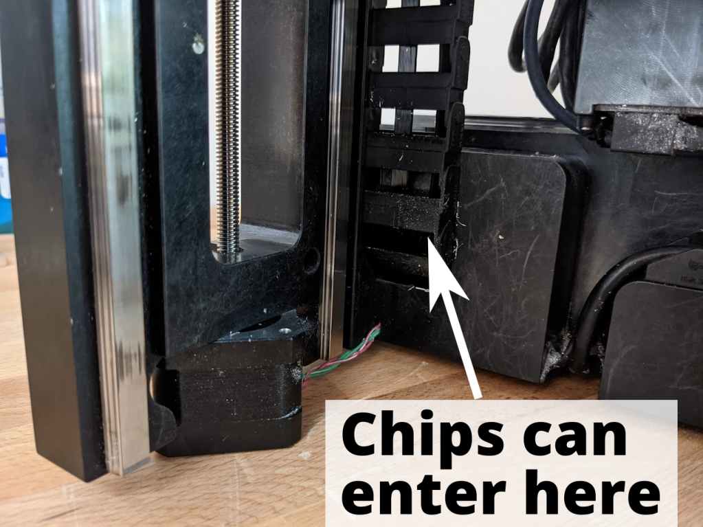 There is a cavity near the back of the machine where the Y axis cables and cable guide retract into. That cavity is exposed to chips flying around, so they tend to accumulate there. There is a hole in the bottom of the machine where the chips could maybe fall out, except the hole is too small for any but the smallest of chips, and further, it is completely sealed off when mounted in the stock Pocket NC enclosure.