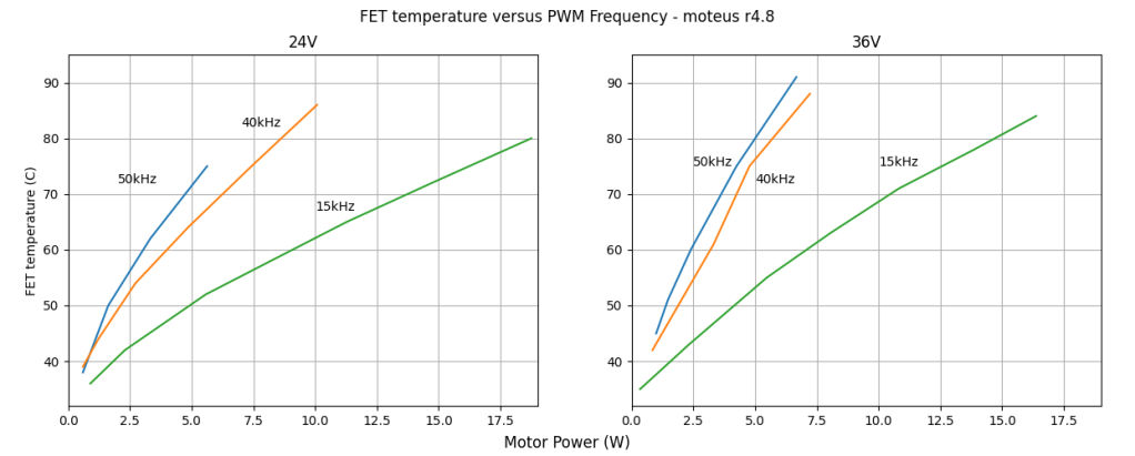 The rated 500W of peak power for moteus (limited to 450W by default in config), can be achieved with the default 40kHz switching rate. By increasing the switching rate, the peak power can be increased to 750W, and if the switching rate is decreased to the minimum of 15kHz, then the rated peak power is around 190W.