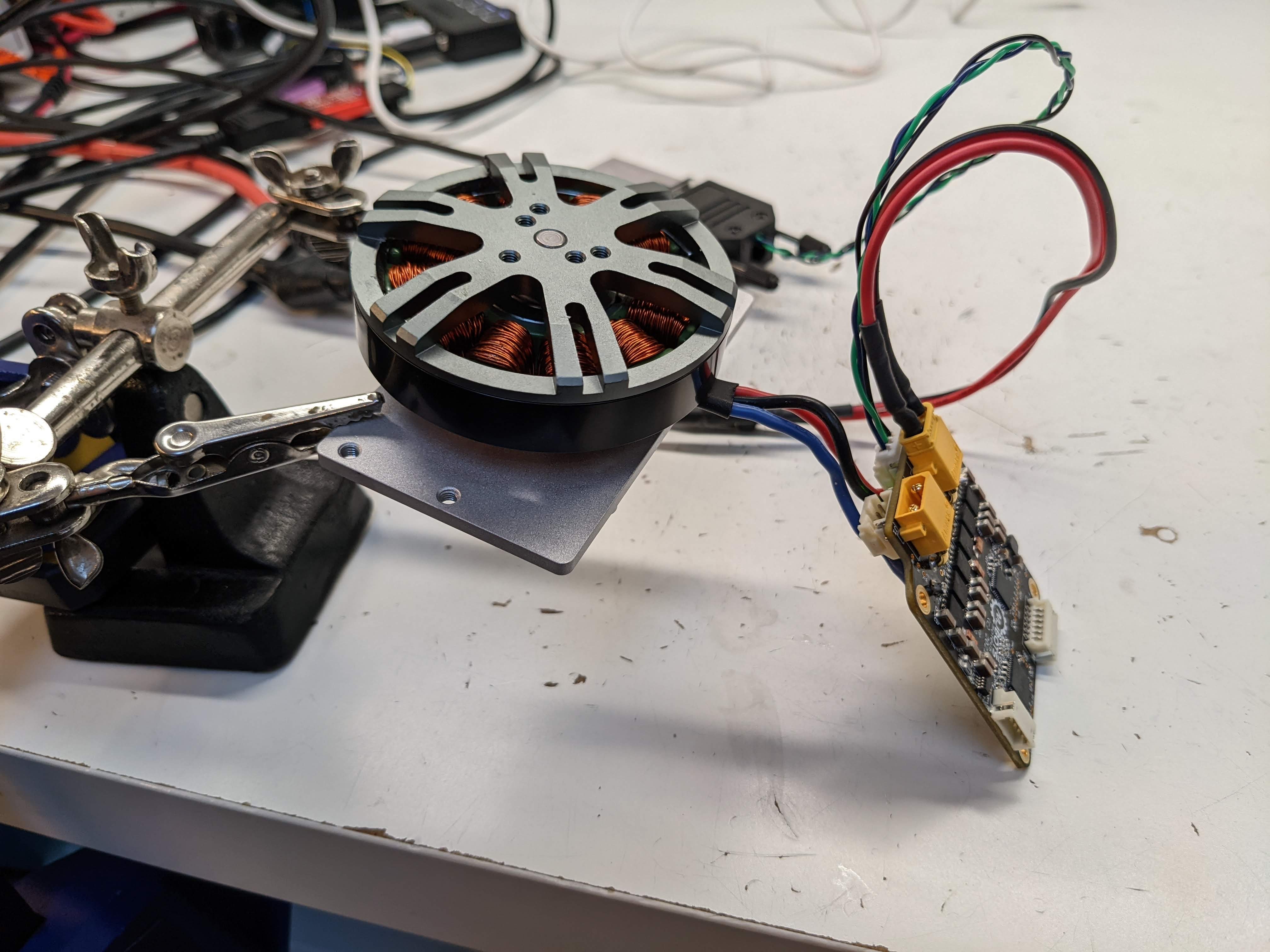 To show the effects of changing the PWM rate on thermal performance, I made up a simple experiment with a moteus r4.8 and an mj5208 attached to a devkit bracket but disconnected from the moteus so that they would be thermally decoupled.