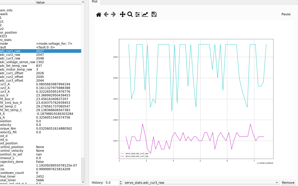 Note how the values of servo_stats.adc_cur3_raw seem to bounce between what looks like their true value and 2048. I have seen problems like this before, related to ADC configuration and clock rate (as - have - others), but absolutely nothing about the ADC configuration has changed in more than a year, so surely that can’t be it, can it?