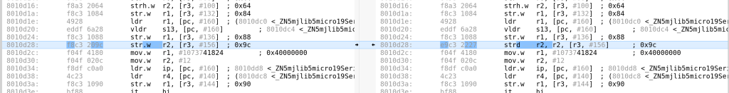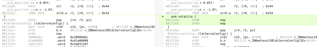 Clearly that change shouldn’t have any impact, so if the problem is at the C++ level, it must be undefined behavior somewhere else, and if it isn’t at the C++ level, it could be anywhere. So, my next step was to look at the difference in the disassembly to see what that code change wrought that the STM32 would see.