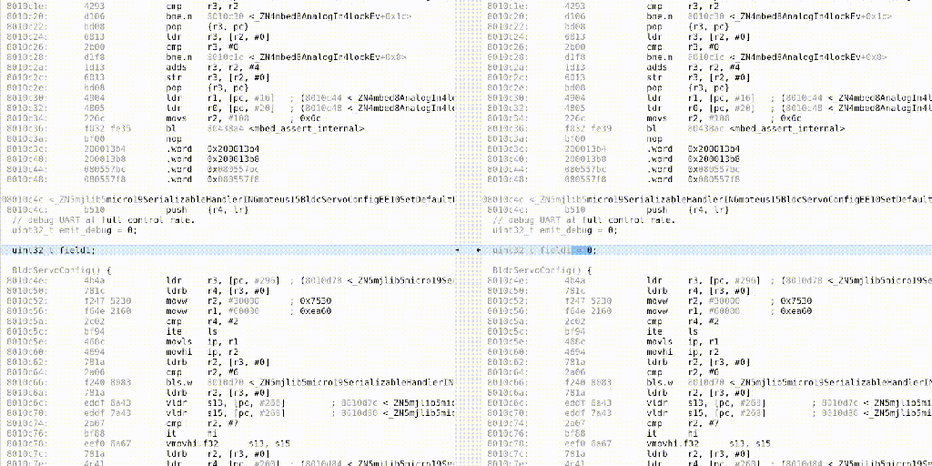 And then looked to see what modified that particular memory location to determine what it was doing. I methodically went through every difference, about 50 of them. I found things like the buffer used to hold CAN-FD frames, timers, nonce counters, the values read by the position sensor and current sensor, and many other things that all seemed perfectly reasonable.