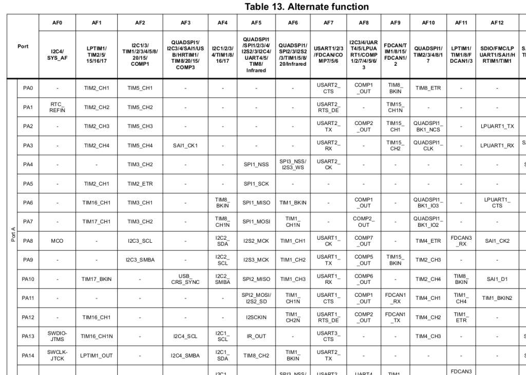 To be useful in the moteus firmware, most of these capabilities need to be accessed through STM32 specific hardware. The one exception is quadrature inputs, for which the firmware can manage slow to moderate rates using interrupts alone, but high rates requires hardware decoding. Complicating this, the STM32G4 only provides access to specific hardware peripherals on specific pins through the alternate function map: