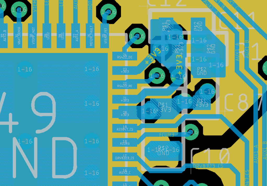 Even before attempting diagnosis, I went ahead and improved the situation for the moteus-n1, as it was in the design process anyway. The moteus r4.11 VREF+ decoupling did meet the official datasheet constraints of a 1uF ceramic capacitor close to the chip, but the ground path for that capacitor may not have been optimal, and 1uF may be insufficient for 5 simultaneous ADC operations. For the moteus-n1 r1.3 board, both a larger 4.7uF capacitor was used for the bulk, along with a separate smaller, 0.1uF capacitor. Also, additional ground vias were placed under the exposed pad along the entire side of VREF+, so that the full current path is short. Here is the resulting layout: