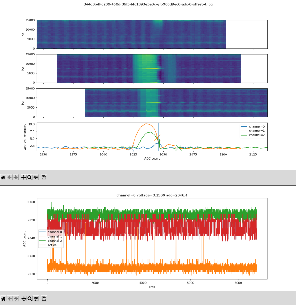 The top 3 plots in the top window show log-normalized spectrograms at each ADC count for each channel. The line graph in the top window shows the overall standard deviation of each channel at each ADC count. The bottom window shows the time domain signal at any given point – clicking on any of the top channels will switch to that given time domain plot. This lets you explore many possible hypotheses, especially those that are not necessarily best represented as noise in the frequency domain. Since the sweeps are over fixed voltages on each channel, the range of ADC values sampled are not the same for each channel, as the zero point bias is different for each channel and board. The big “X"s on the standard deviation plot shows where the zero point was for each channel.
