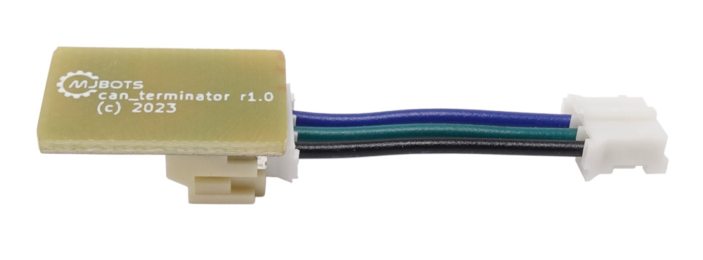 Second, is a pre-built CAN-FD termination resistor that can be directly plugged into a JST PH3 receptacle on the moteus controller. This uses split termination to achieve 5Mbps bandwidth over longer daisy chains than can be achieved with a simple one-resistor terminator.