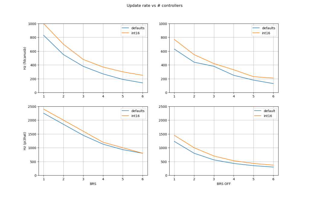 And here are the results. The top plots use fdcansb, the bottom use pi3hat. The left plots use BRS and the right plots use BRS disabled. The y axis is achieved update rate in Hz and the x axis is number of controllers on the bus.