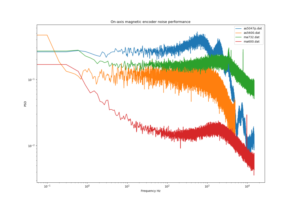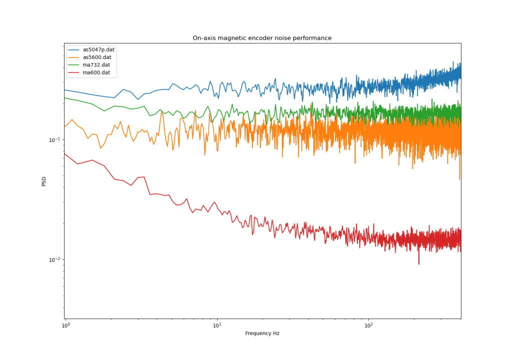 The biggest advantage of the MA600 vs the AS5047P that is integrated into moteus or other similar hall effect sensors like the AS5600, MA702, or MA732 is the lower noise and improved non-linearity. To show the lower noise, I captured a power spectral diagram showing those 4 encoders mounted in similar configurations, the plot is below.