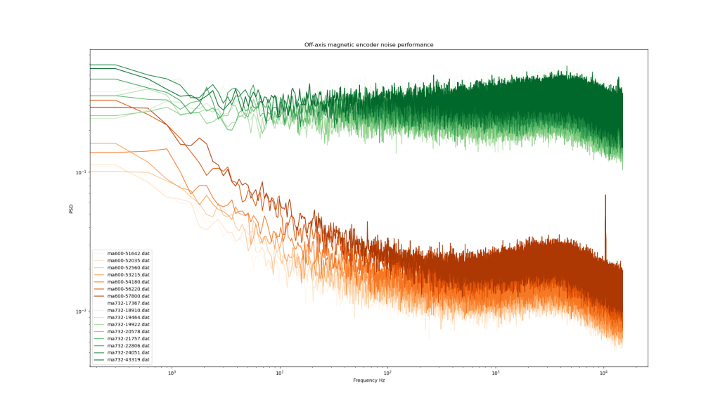 In an off-axis configuration, the MA600 has a similar improved performance compared to a MA732. Here I mounted the encoder off-axis with a diametrically magnetized ring magnet of 32mm diameter, used the measure_ma732_bct.py script for both MA732 and MA600 to compensate for the off-axis configuration, then captured a power spectral diagram in the same manner as above. Notably however, in the off axis configuration, the observed noise performance is significantly influenced by the orientation of the local magnetic field. So for each of the MA600 and MA732, I have recorded performance curves from a selected set of positions to try and capture the range of performance that would be observed.