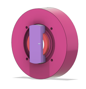 That is not a terribly common magnet configuration, but there are some vendors. For this experiment, I used a 32mm OD ring magnet from RLS that is intended for use with their Orbis line of encoders, part number BM220C320A1ABA00. The motor I am using for this test is a T-Motor GL80, which has a hollow shaft. To mate the magnet to the motor, I 3d printed a fixture (purple) which slipped over the bearing surfaces of the GL80 (pink), and captured the magnet (red).