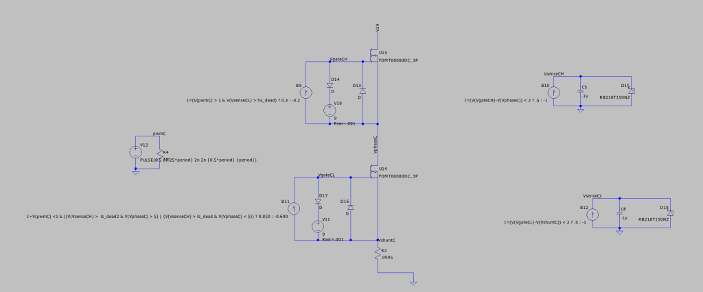 Each half of the H bridge included a current source that would either charge or discharge the FET using a current that matched the configured drive strength. Clamping voltage sources and diodes ensured that the gate drive voltage matched what the actual device provided. Much of the non-linearity was directly related to the behavior of the DRV83x3 gate driver, particularly its shoot through protection. To model that, a separate “sense” circuit was used which charged a capacitor to time how long the opposing gate had been turned off.