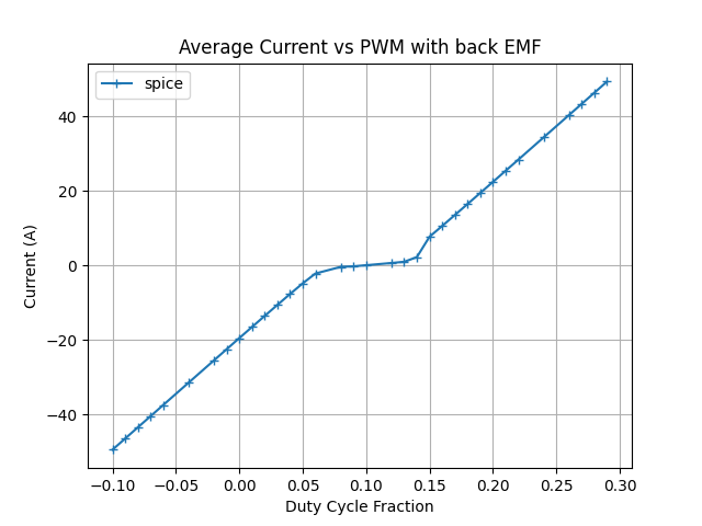 The surprise came when I ran the simulation assuming that the motor was spinning and was producing back EMF. This was hard for me to capture clean traces of on the oscilloscope, but it was trivial to capture in LTSpice. Once I did that, I had my big a-ha moment. The non-linearity was not in fact around 0 PWM duty cycle, but instead around 0 current!