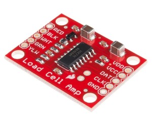 That transducer then connects to a SparkFun HX711 breakout board to produce an analog output signal.