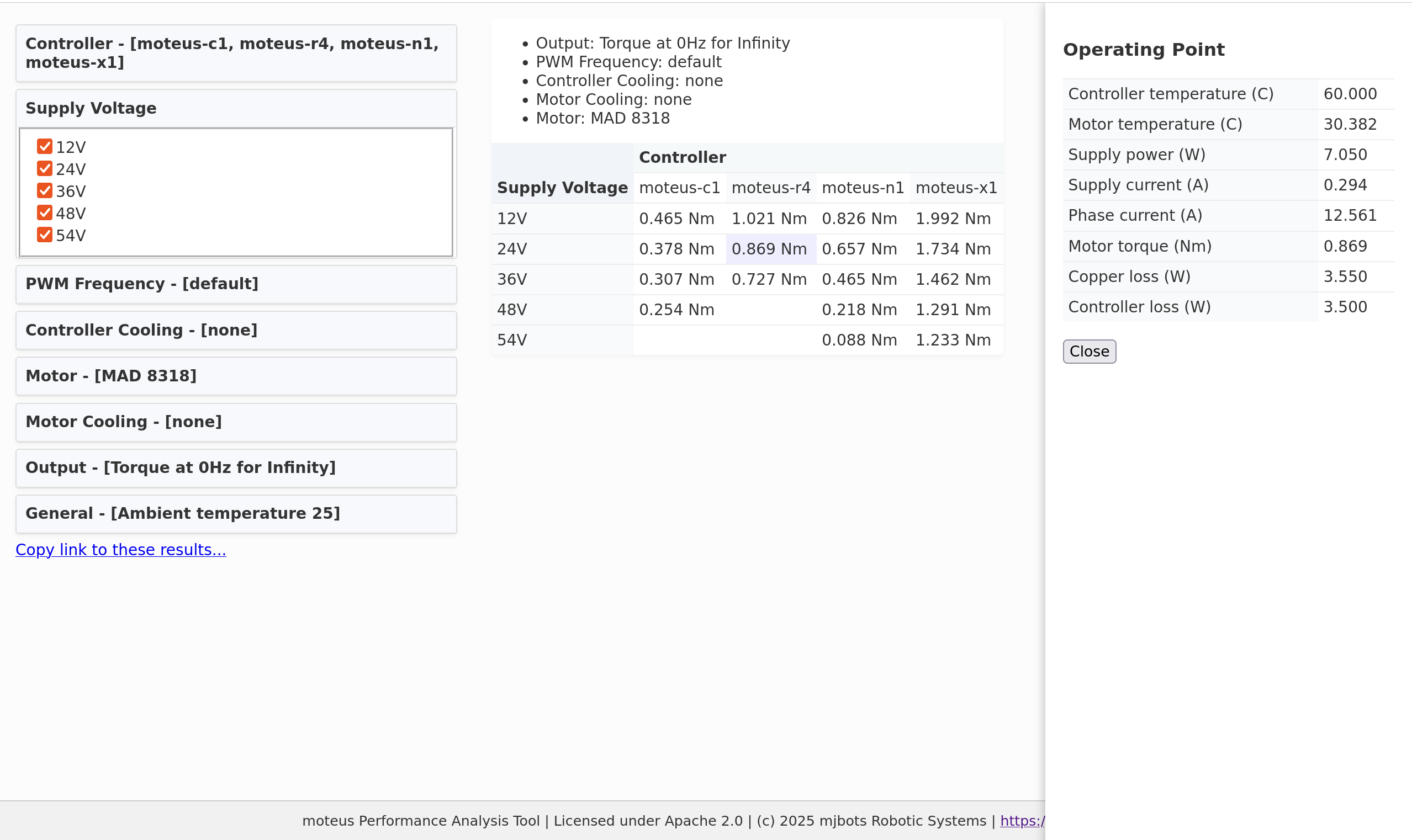 - Copy-paste result pages: Very often people ask specific questions of the form: “can moteus drive this motor”, or “what voltage do I need, or “which controller is best”. I want to be able to share a link to a page showing specific comparisons.