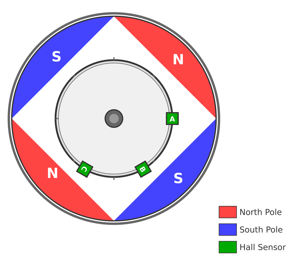 Hall effect encoders often integrated into brushless motors are designed primarly to achieve this latter commutation function, and thus count exactly 6 times for each electrical revolution of the motor. They accomplish this by positioning 3 “hall effect” magnetic field sensors such that they either detect the actual rotor magnets, or an auxiliary multi-pole magnet ring affixed to the rotor.