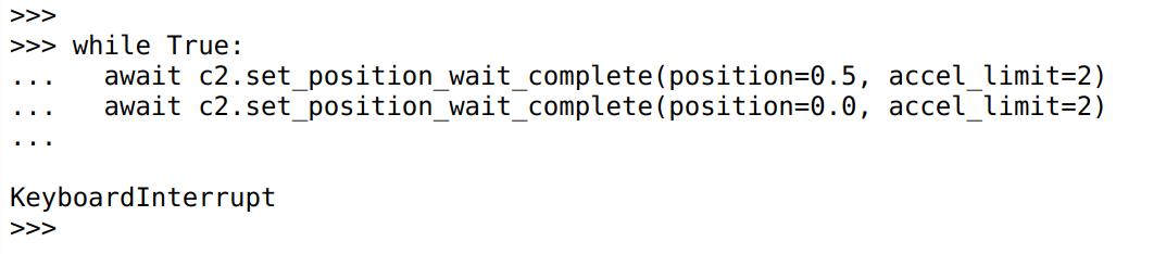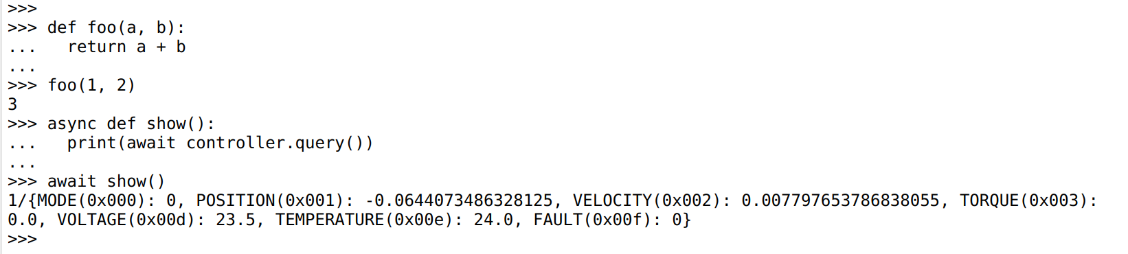 The bottom console now has two tabs, the first and default remains the diagnostic console, where you can see what diagnostic messages the devices are emitting and send diagnostic channel commands directly to connected devices. The new, second tab, is labeled “Python” and provides access to a fully functional Python evaluation environment with full access to the moteus python library, including asynchronous operations.