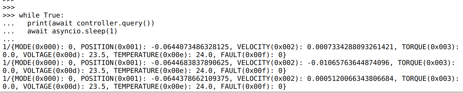 Which will communicate with the controller with CAN ID 4. The argument to get_controller can be a CAN-ID, a UUID, a moteus.DeviceAddress, or any string that would be usable as a prefix in the diagnostic console.