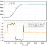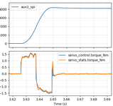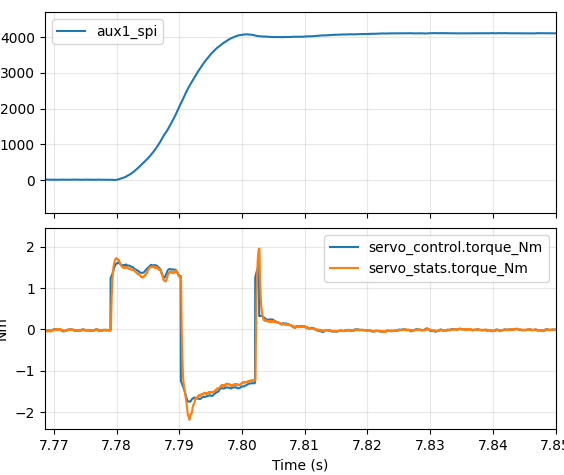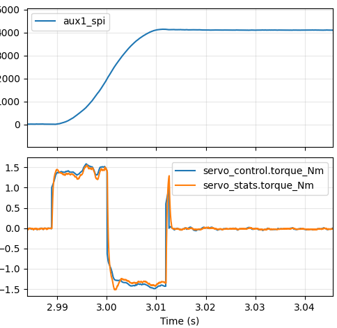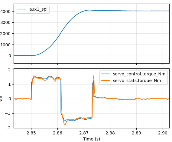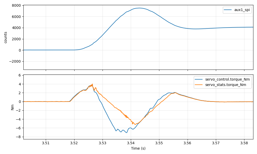Better at around 37ms, but still not great. In our ideal world, we would command maximum positive torque right until roughly the halfway point, at which point we would command maximum negative torque. The first approach I decided to take was to add an “inertial feedforward” term into moteus. When executing an acceleration limited trajectory, the “control acceleration” is multiplied by an estimate of the total system’s moment of inertia to produce a feedforward torque at each time step. Since moteus implements a constant acceleration planner, that will result in a fixed positive torque until the halfway point, then a fixed negative torque until the final stopped point. That is unlikely to be optimal, as power or speed limits may mean that the achievable torque differs at different speeds, but it is at least a start.