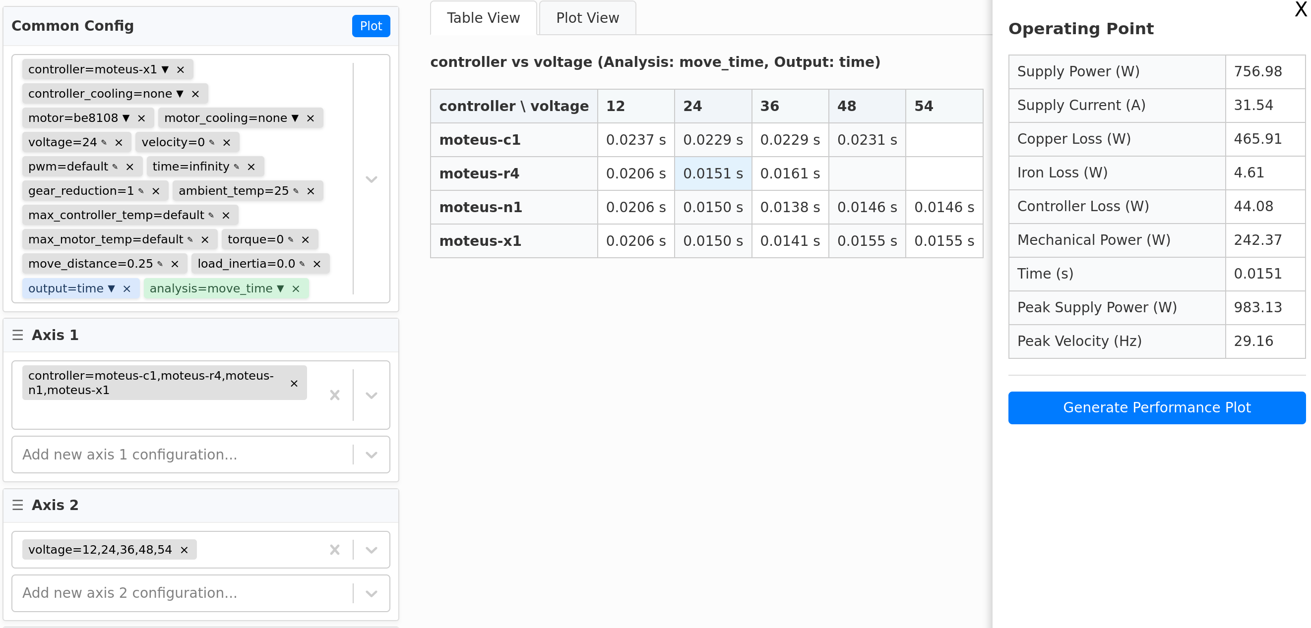 In addition to the total time required for the move, the analysis also emits averages for all the loss terms, the peak supply power and peak velocity achieved.