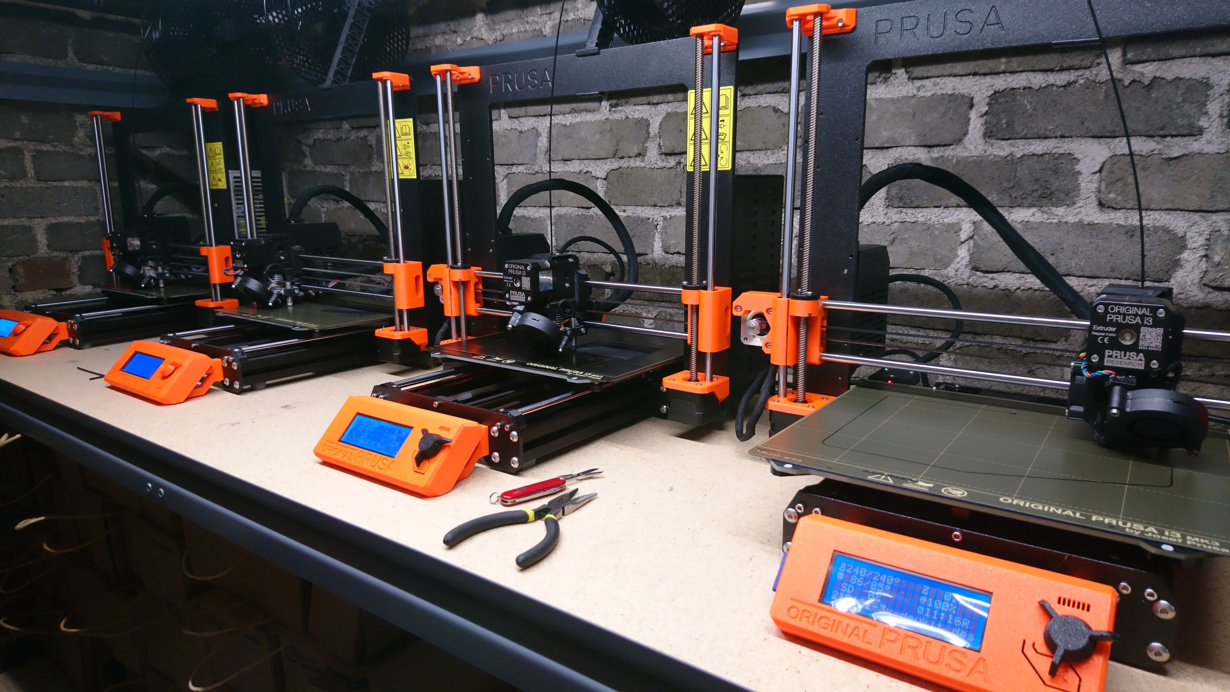 This is somewhat belated, but only recently have I actually gotten them all set up in the desired configuration. Welcome to the newest members of the mjbots factory line, another 2 Prusa MK3Ss! That makes 4 total, now all neatly lined up in a row: