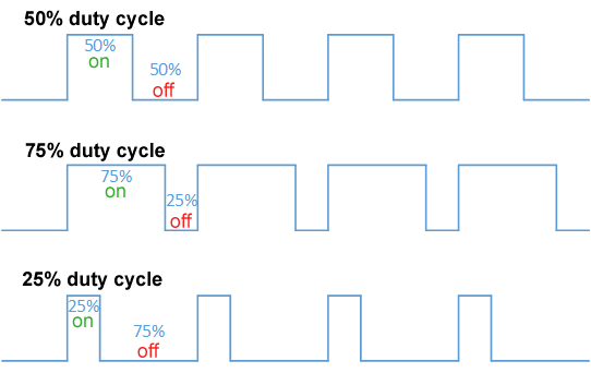 A pulse width modulated signal is a logic level signal of a fixed frequency, where the duty cycle, or width of the pulse, is changed or modulated to communicate a scalar value. Obligatory Wikipedia diagram below: